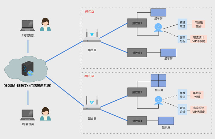 该客户为宁波地区零售门店,在一段时间内,客户发现门店销售额持续下滑,但是不知道原因出在哪里,到底是消费者减少,还是广告推送出现问题,亦或是其他原因,客户没有头绪,金年会|金年会·jinnian科技数据化门店显示系统完美的解决了客户痛点,方案拓扑图如下: