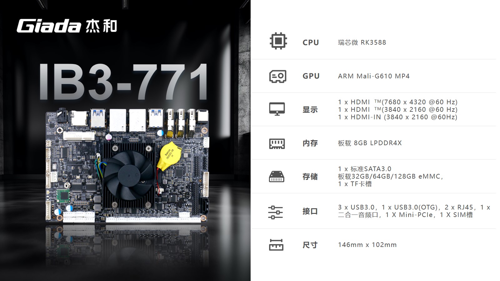 金年会|金年会·jinnian工业级ARM主板IB3-771采用瑞芯微RK3588处理器,内置G610 MP4 GPU,拥有6 TOPS算力的NPU,支持8K视频硬件解码编码及多摄像头输入,支持eDP/DP/ HDMI2.1/MIPI 多种显示接口。