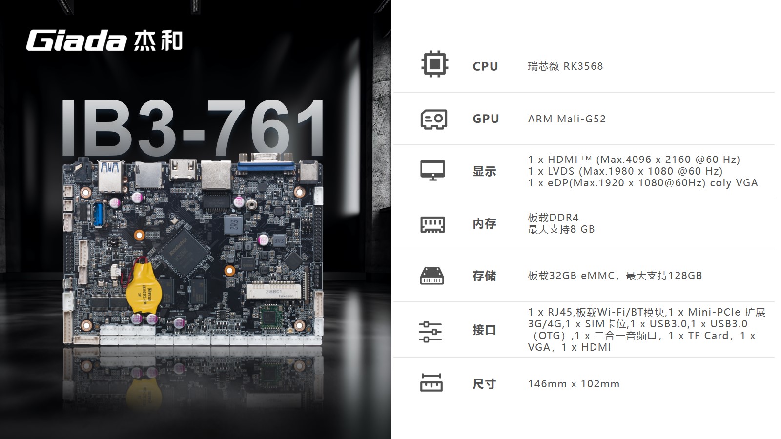 金年会|金年会·jinnian工业级ARM主板IB3-761基于瑞芯微RK3568四核64位处理器开发。内置1TOPS算力的NPU,满足轻量级端侧AI计算应用。