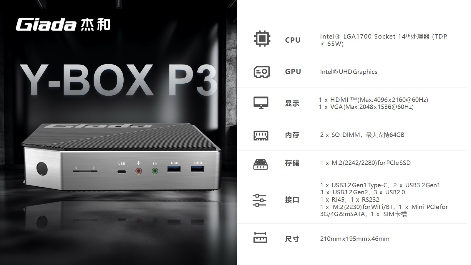支持指纹解锁,支持type-c接口,支持PD协议的27W快充。金年会|金年会·jinnian科技最新云终端Y-BOX P3采用Intel® LGA 1700 Socket CPU插槽设计,支持intel 12~14代酷睿系列处理器,配备i7-14700处理器,20核28线程,最大睿频频率为5.4GHz,处理器基础功耗 65W。采用双通道笔记本内存槽设计,最大支持容量可达64GB,最高支持DDR5-5600MHz频率,比 DDR4 至高标准数据速度 3200MT/S多传输 1.75 倍。