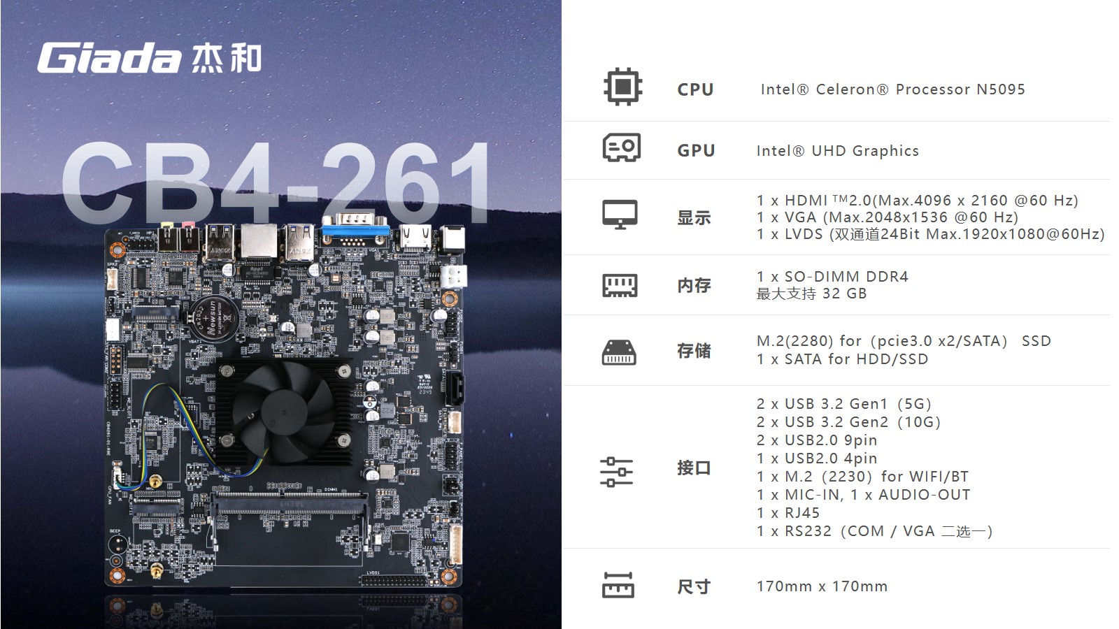 金年会|金年会·jinnian科技CB4-261尺寸仅有170x170mm,小而精巧。搭载N5095芯片,该芯片采用10nm制程技术,四核心设计,支持Windows 、Linux系统,可满足多种终端机应用场景的需求,如信息查询、基本数据处理等。