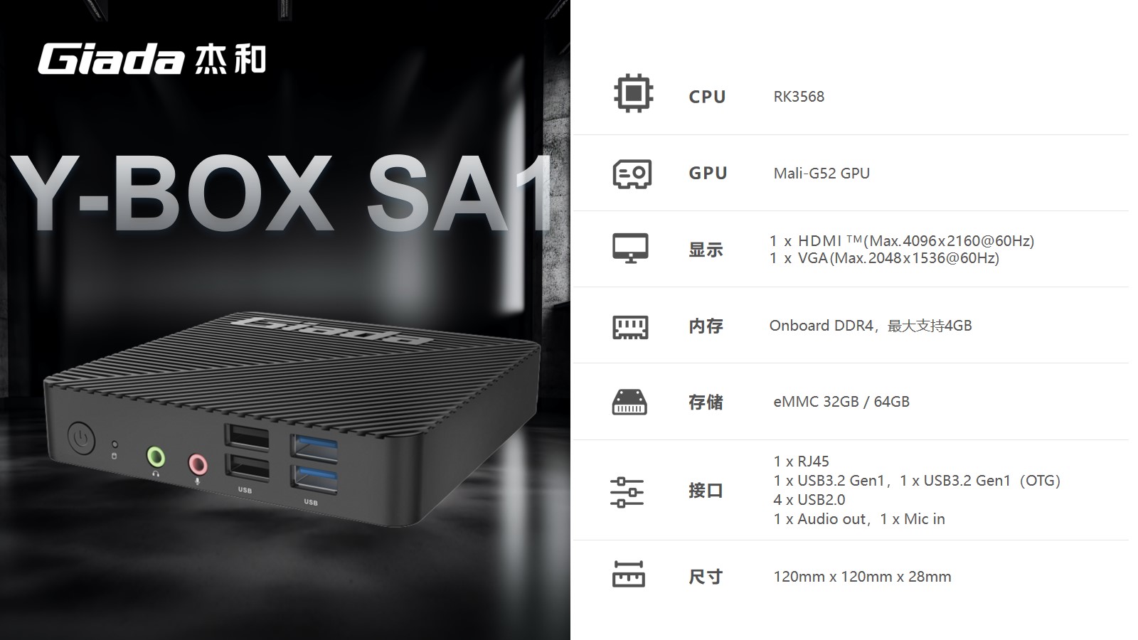 金年会|金年会·jinnian科技Y-BOX SA1选用瑞芯微RK3568处理器,采用Cortex-A55架构,拥有四颗主频高达2.0GHz的高性能核心,支持1T算力,内置的ARM Mali-G52 2EE GPU进一步提升了图形处理性能,确保为用户提供卓越的视觉体验。