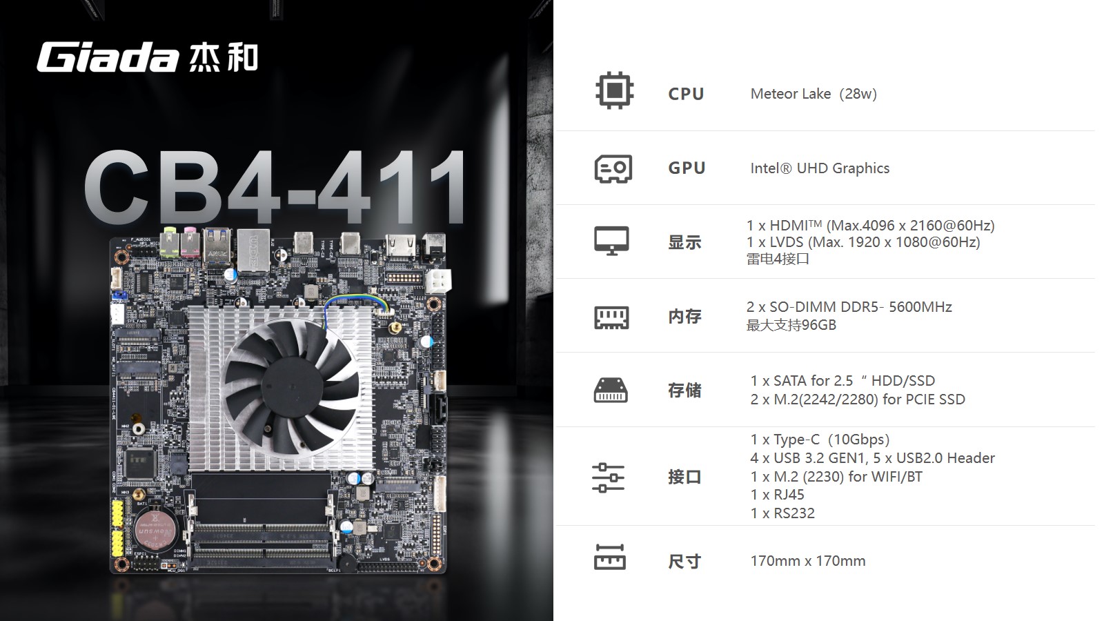 基于人们日渐新增的AI算力需求,金年会|金年会·jinnian科技推出AI一体机专用主板——CB4-411。该主板设计紧凑,尺寸仅为170mm x 170mm。
