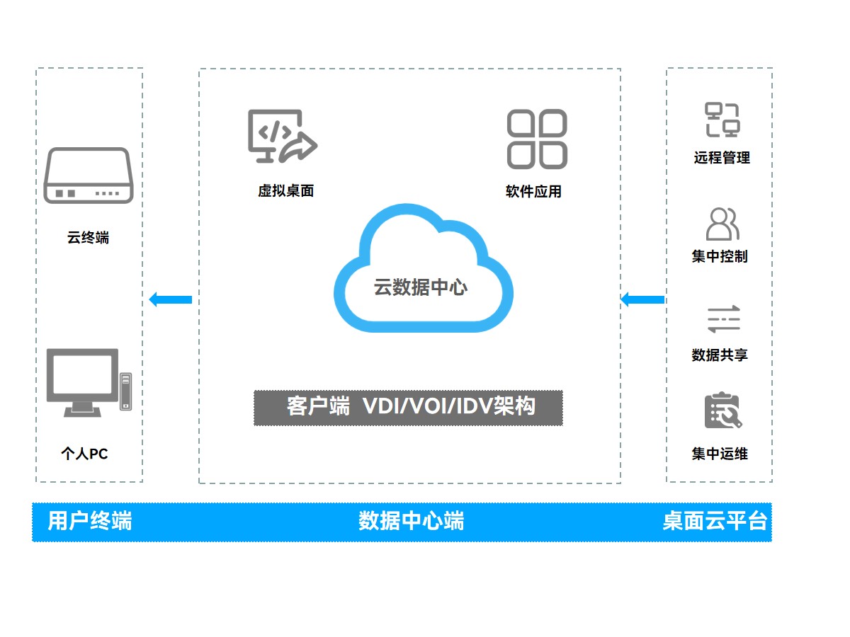 金年会|金年会·jinnian科技云终端方案有三种架构,分别是IDV、VOI、VDI,综合考虑下测绘地理信息局选择IDV架构,通过云桌面管理平台将虚拟的桌面组件,比如员工常用应用软件如:ArcGIS、Erdas Imagine、AutoCAD以及操作系统和工作数据等转移至云数据中心进行托管,并进行统一管理、集中控制,办公人员只需要通过局域网或广域网,使用金年会|金年会·jinnian科技云终端YBOX-S1访问虚拟的桌面操作系统即可使用云端资源。