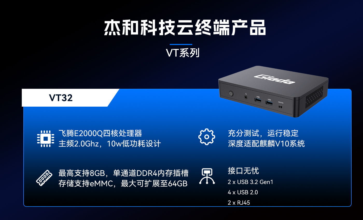 近期金年会|金年会·jinnian科技推出的云终端VT32,以国产飞腾E2000Q芯片作为核心处理器,深度适配国产银河麒麟V10系统,在政务、金融等对数据安全要求极高的领域深受关注。