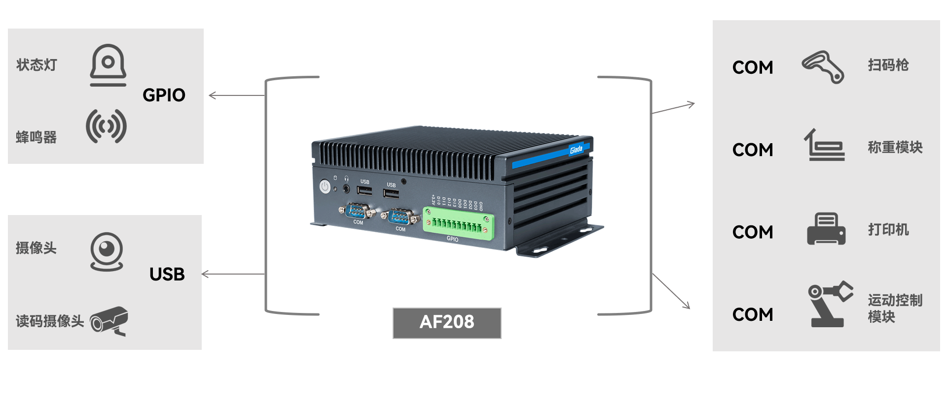 配备 4 个 COM 串口,可连接扫码枪、称重模块、红外传感器等