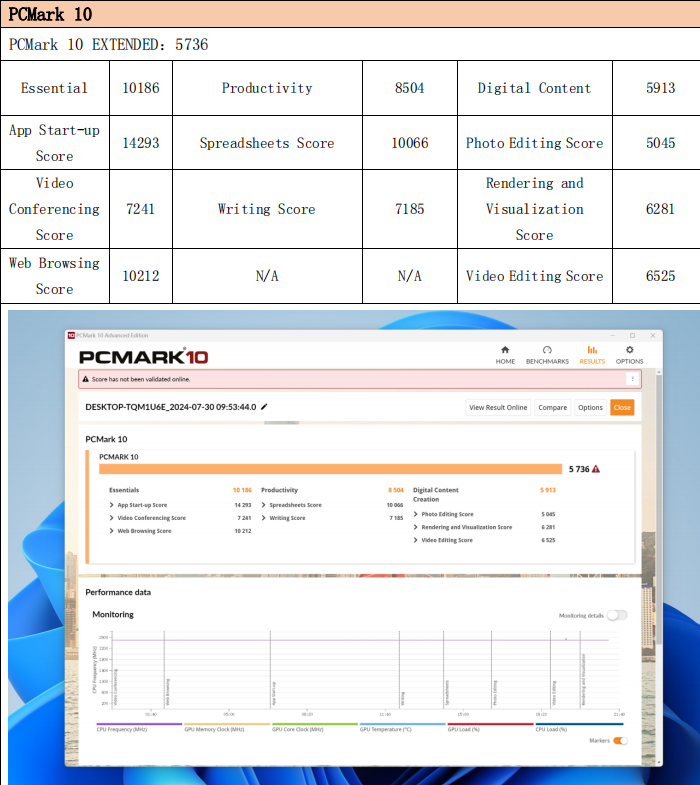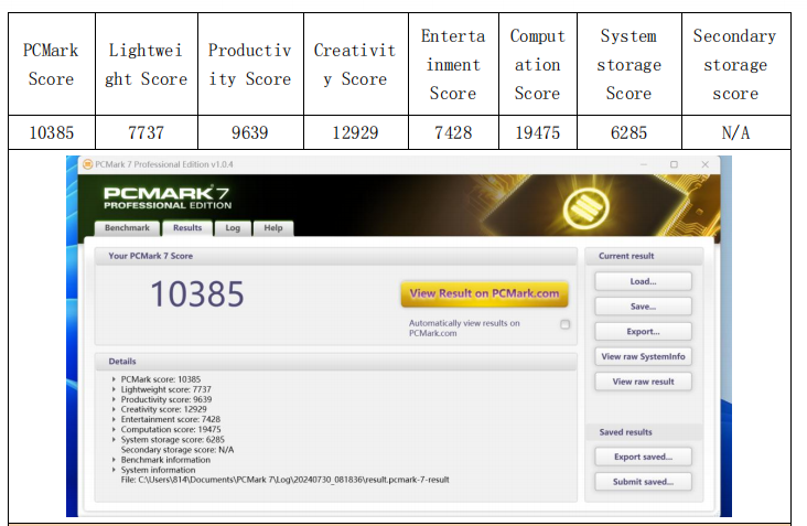 在系统综合性能方面,WA814同样表现出色。PCMark 7总分10385,PCMark 8得分4563,PCMark 10得分5736,说明它不仅能应对复杂应用程序,还能胜任高效率的多任务办公。