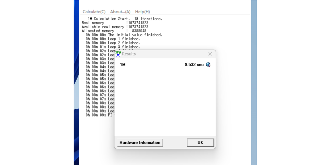 为了评估 CPU 的性能,金年会·jinnian使用了Super PI 1.1 进行了测试,软件以用时为参考成绩,花费时间越短代表计算性能越强。在本次测试中,Core i5-13400 处理器用时 9.532 秒完成了计算,属于当前中端处理器的主流水平,足以应对日常编码、分析和轻量建模任务。