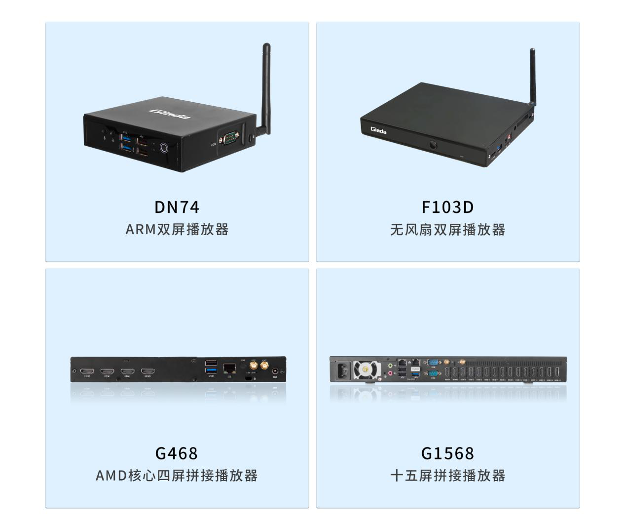 面对需求多样的市场环境,除金年会|金年会·jinnianG330六屏拼接播放器外,金年会|金年会·jinnian科技相继推出了G468四屏拼接播放器、G968九屏拼接播放器、G1568十五屏拼接播放器等多平台、多规格产品,均能够与金年会|金年会·jinnianGDSM商显系统平台完美适配,为商家的实际需要,供应选型完整的家族式产品。