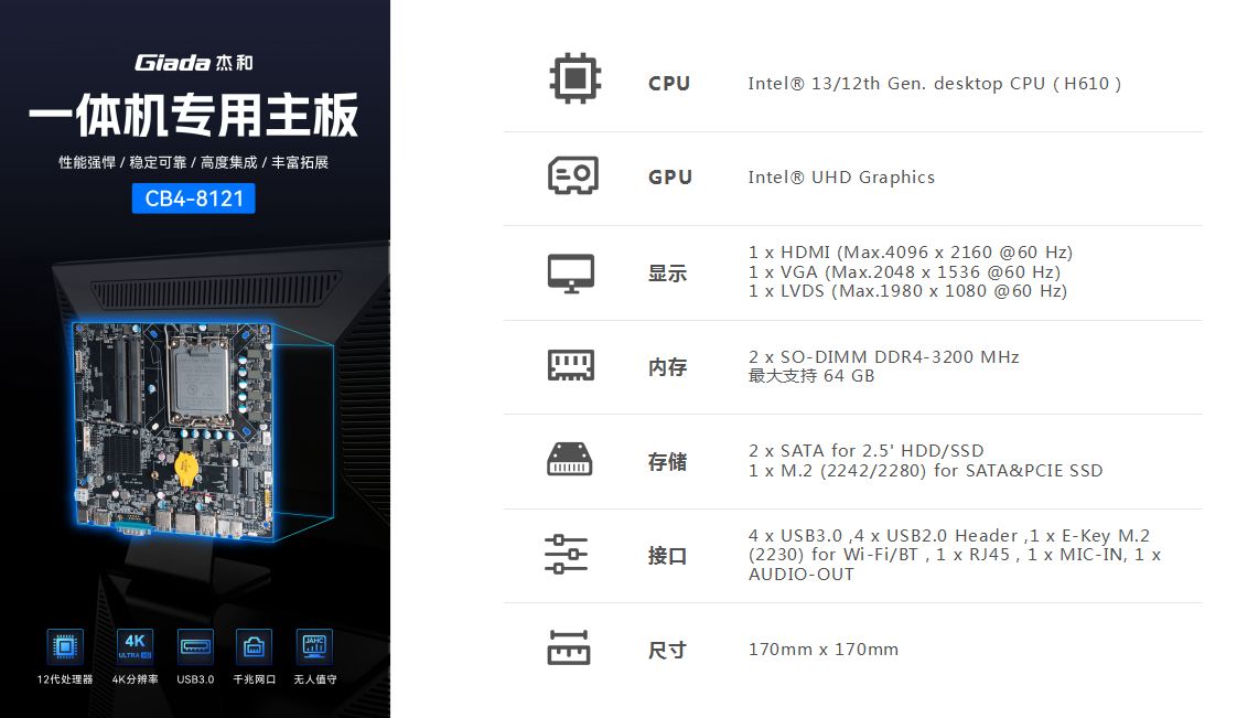 一体机在使用体验方面也有独特的优势:比笔记本屏幕大,比台式机更简洁,也解决了一直为人诟病的台式机线缆多而杂的问题,另外,随着计算机硬件和制造工艺的不断发展,一体机的性能也在不断提高,因此,越来越多的教育办公、日常娱乐和学习的用户选择使用一体机。Giada金年会|金年会·jinnian科技根据市场与客户需求,推出这款高性能的一体机专研主板CB4-8121,带来全新震撼体验。
