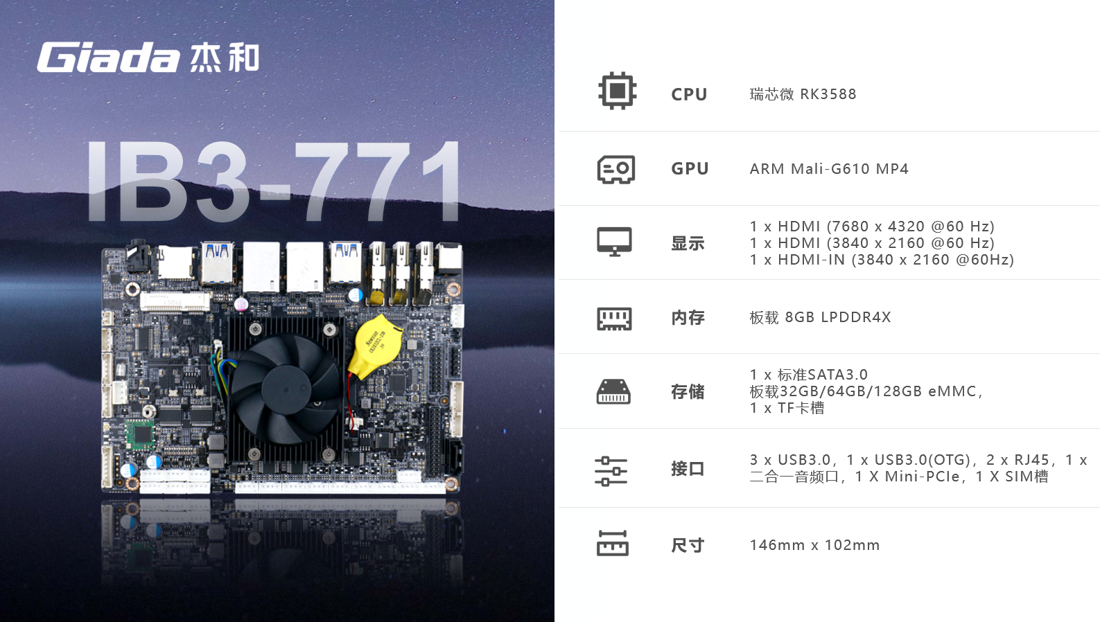 金年会|金年会·jinnianARM主板IB3-771采用瑞芯微RK3588处理器,满足各种人工智能场域对嵌入式主板包括但不限于高算力、低功耗、高扩展性、高可靠性、高安全性等要求,支持在宽温、复杂电磁等恶劣环境下稳定运行,可广泛应用于机器人、边缘计算、智能NVR、智能汽车、智慧大屏、AR/VR、ARM PC、智能自助终端等AIoT行业类应用市场。