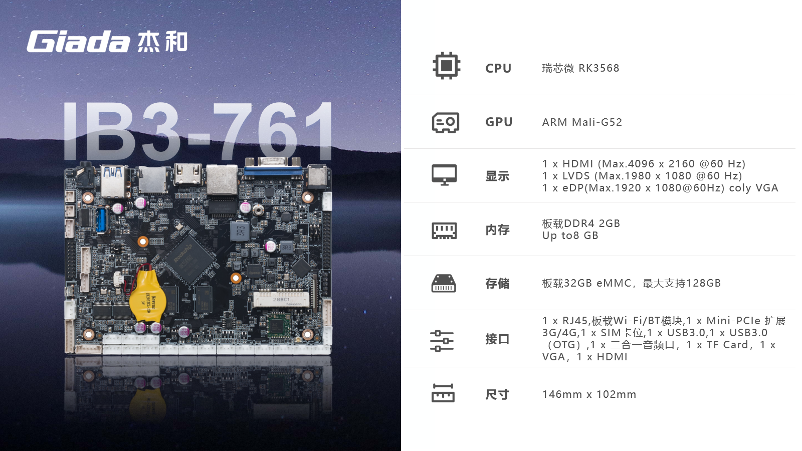 金年会|金年会·jinnianARM主板IB3-761基于瑞芯微RK3568四核64位处理器开发,可实现多任务并行、更大数据集的高效处理,丰富的接口,具有性能强、内存大、集成度高、扩展能力强等特点,在处理速度和图形处理能力方面都表现出色,可广泛应用于物联网网关、边缘存储、工控平板、工业检测、工控盒、自助终端、云终端、车载中控、机器人等行业定制市场。