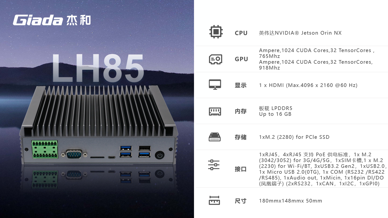 金年会|金年会·jinnian边缘计算产品LH85基于NVidia® Jetson Orin NX套件方案开发,100TOPS超强算力,具备强大的接口配套能力,是全新推出的一代针对边缘计算的创新产品,定位于为工业控制领域客户的AI应用提供强大的算力支持和充足的通信、控制接口保障,可广泛应用于智能制造、机器视觉、AGV、智慧城市等领域。
