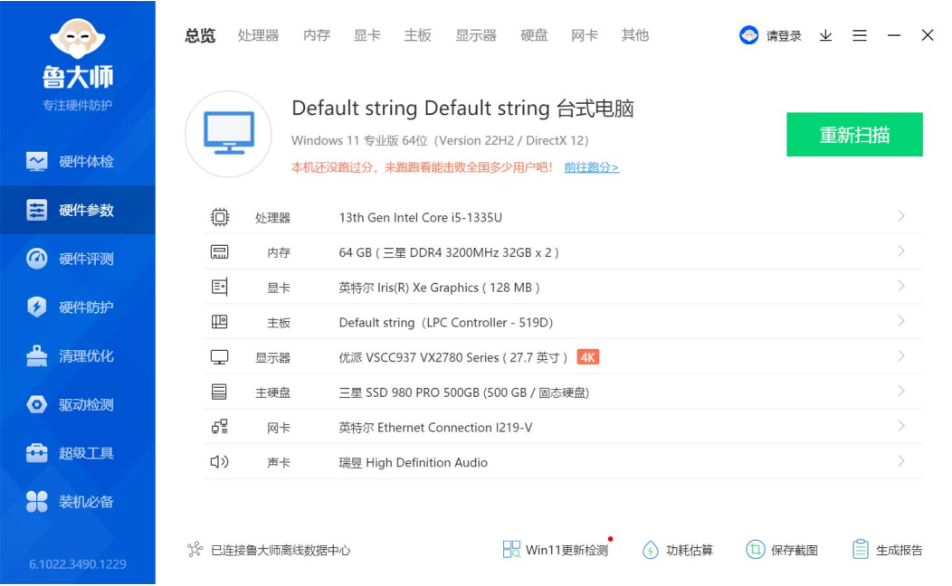 上面是鲁大师识别的金年会|金年会·jinnianAE613硬件参数详情,金年会·jinnian进行跑分测试的核心三大件选择的是13th Gen Intel(R) Core(TM) i5-1335U @1.30GHz处理器,Intel(R) Iris(R) Xe Graphics显卡,三星 32GB*2 DDR4 3200MHz内存,三星SSD 980 PRO 500GB(500 GB/固志硬盘),下面金年会·jinnian来看详细的跑分数据。