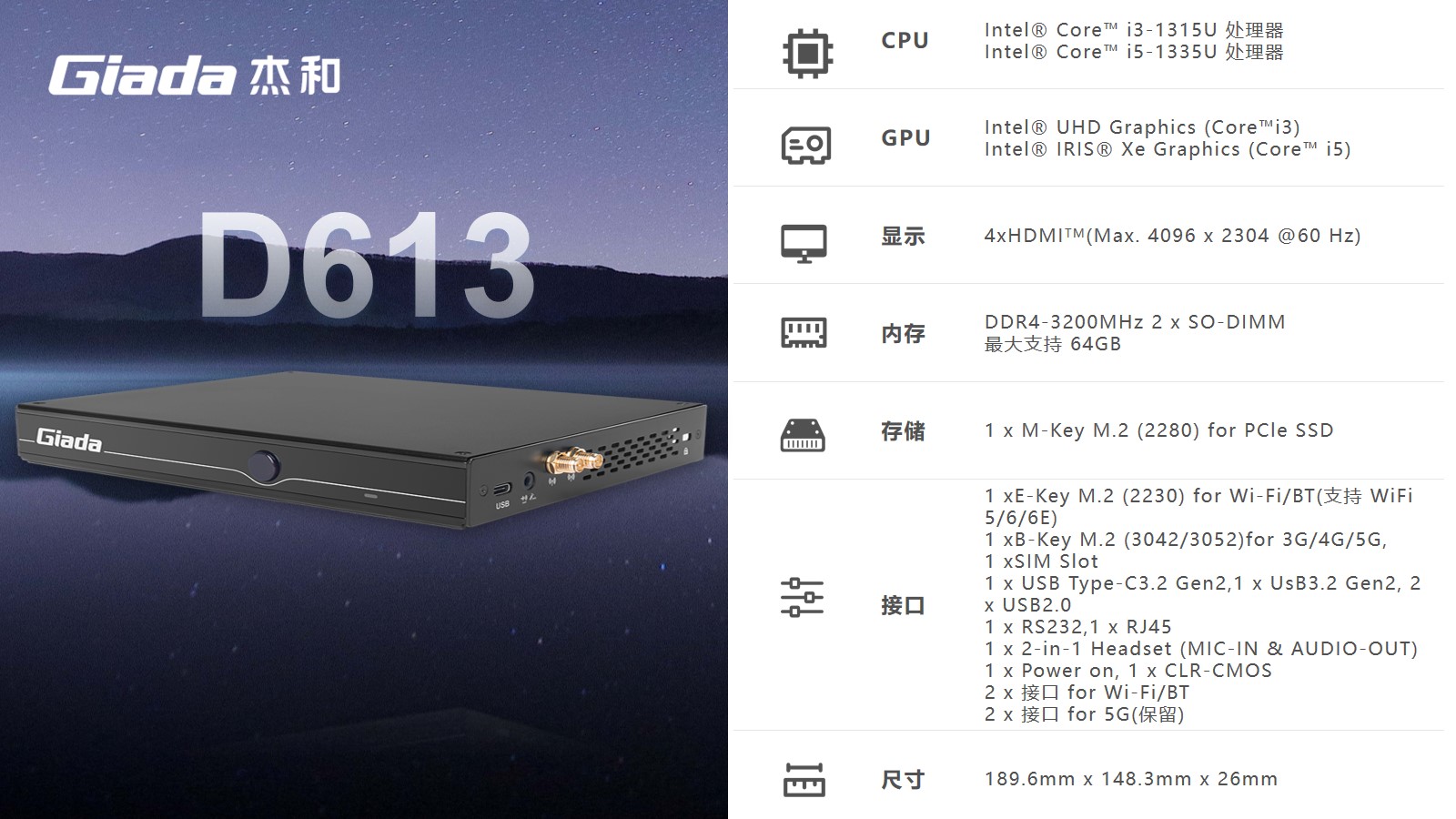 金年会|金年会·jinnian科技D613采用Intel®第13代AlderLake处理器i3-1315U、i5-1335,比第11代性能提高19%,Intel® IRIS® Xe GPU (Core i5),图形性能较上一代提升50%。