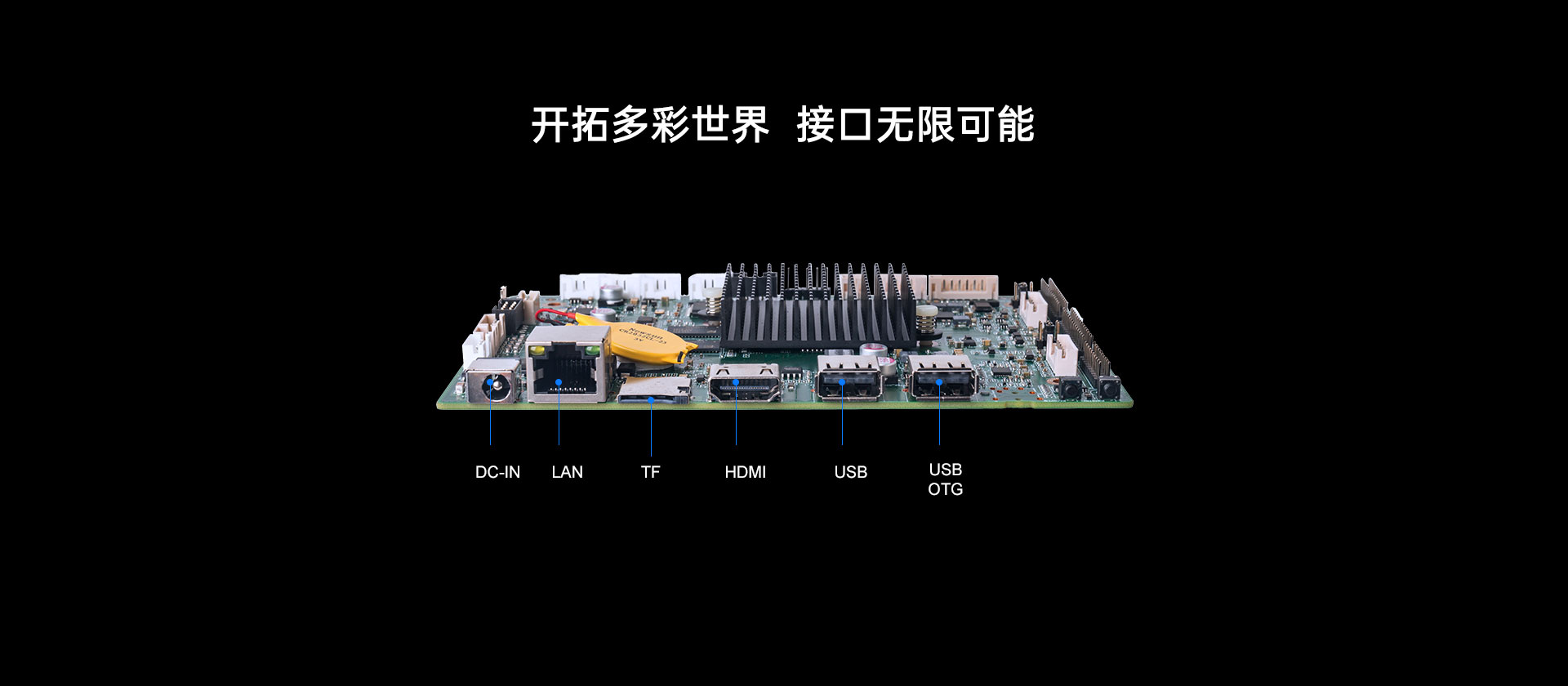 外部I/O | 接口 | 1 x HDMITM(Max.4096 x 2160 @60 Hz) 1 x LVDS(Max. 1920x1080@60Hz)(可选eDP/MIPI-DSI) 1 x USB2.0(OTG),1 x USB2.0 1 x RJ45 1 x TF卡槽 1 x 2-IN-1 Headset (AUDIO-OUT & MIC-IN) |